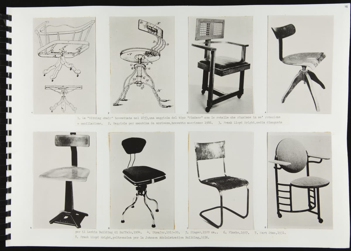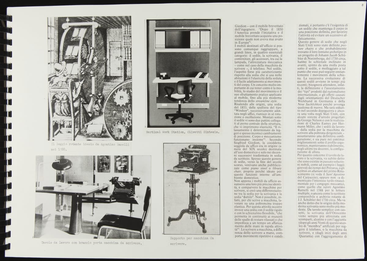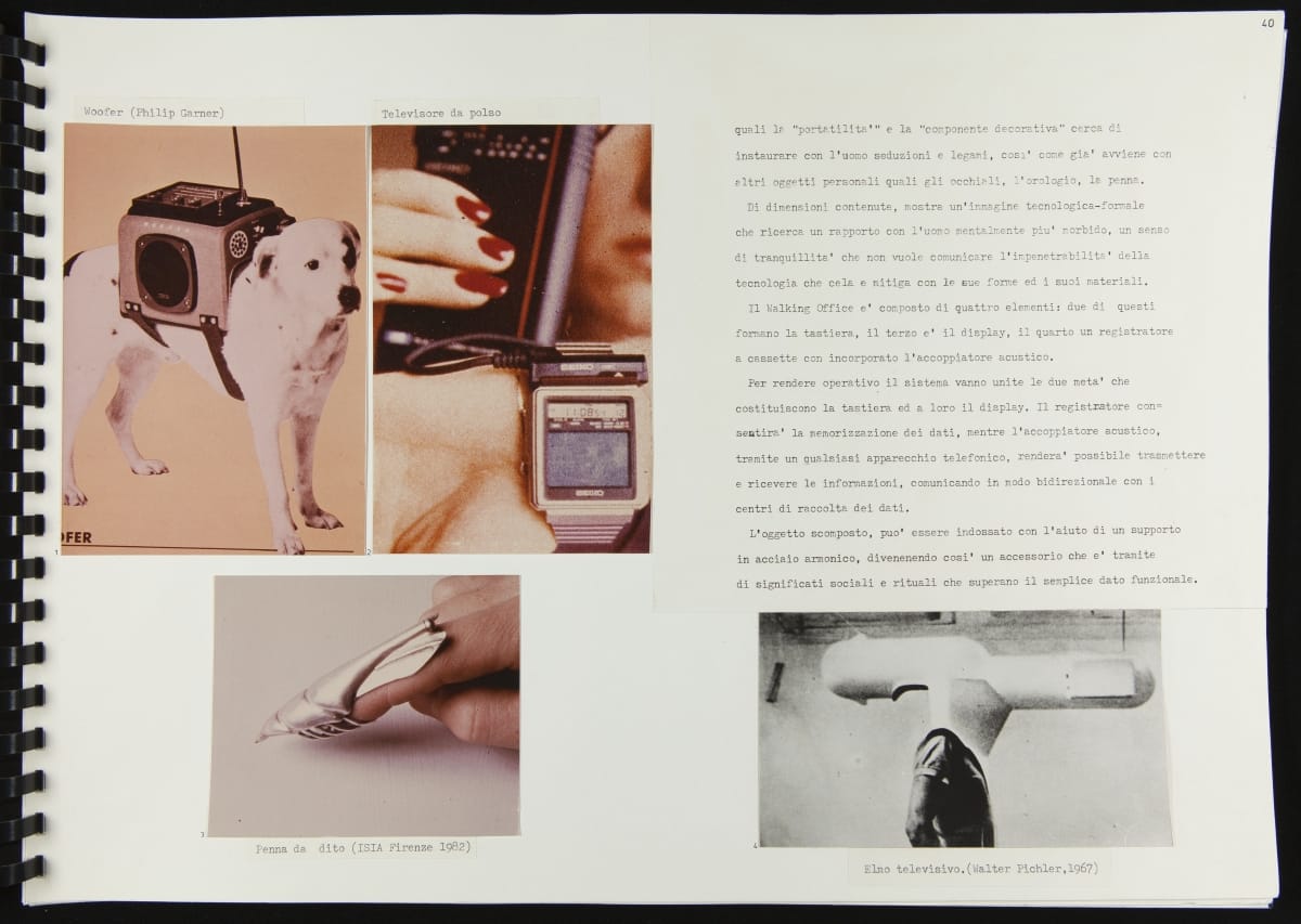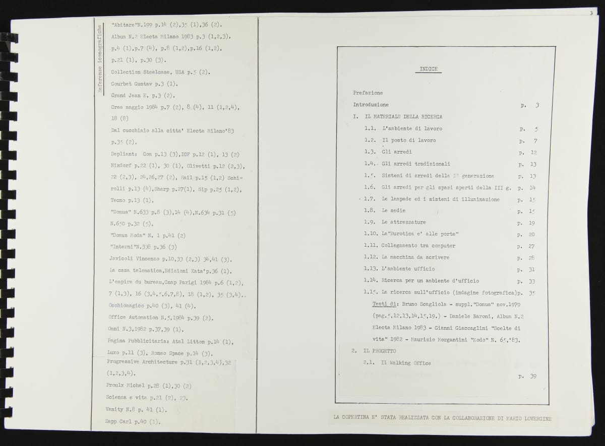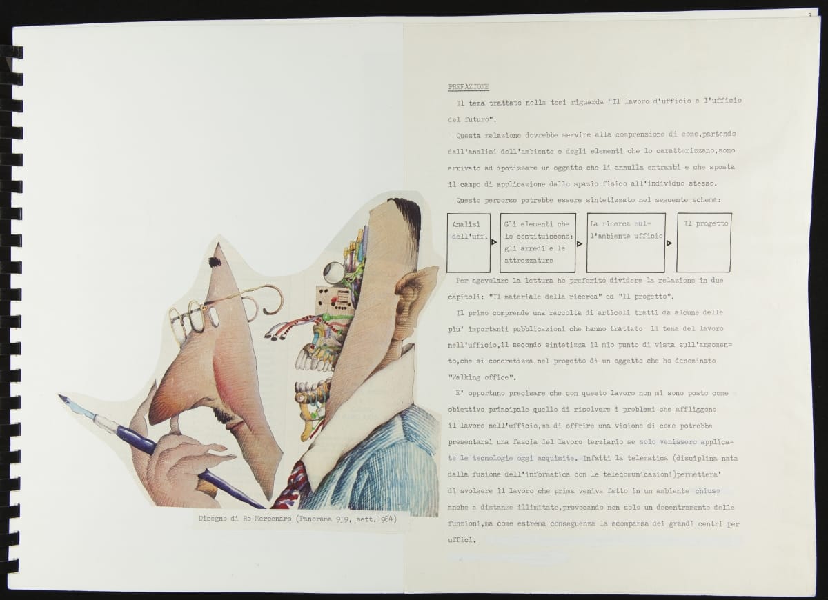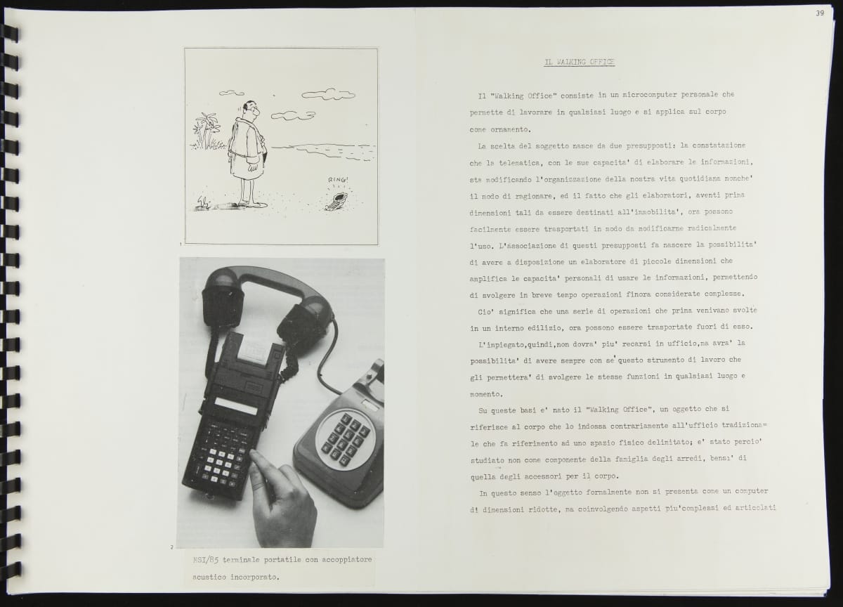 The Walking Office Wearable Computer is a prototype model created by the collaborative design group Salotto Dinamico. This illustrated thesis along with conceptual drawings were submitted by Vincenzo Iavicoli to fulfill his Industrial Design degree. They contain research that informed the prototype: the history of office furniture, office technology, and intangible aspects such as the psychology of work environments.