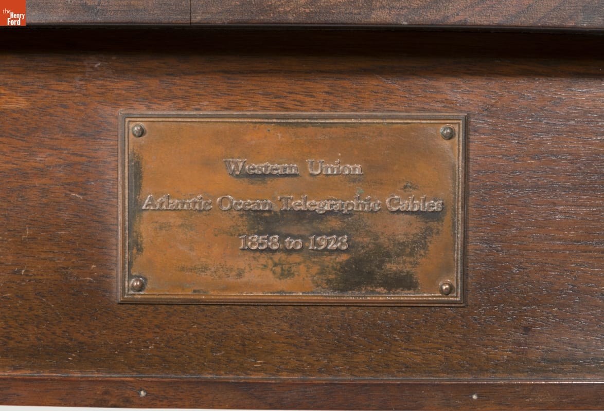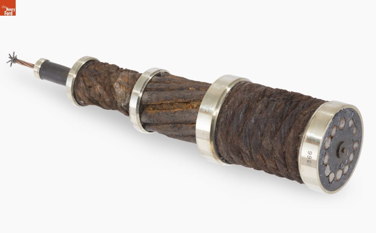 This display contains transatlantic telegraph cables from 1858-1928, showing an evolution of materials and technology. In 1858, the first communications cable was laid across the Atlantic--but it failed shortly after. A second cable installed in 1866 was much more durable. By 1902, the world was surrounded with these undersea cables, allowing instant communication and the formation of a "global village."