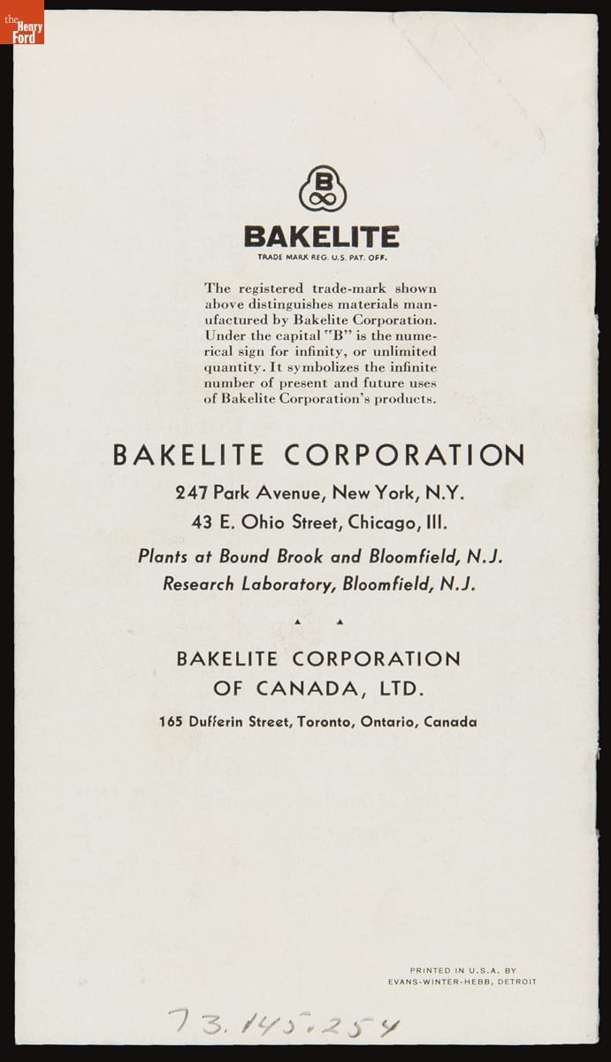 A robust promotional campaign launched in the mid-1920s helped make Bakelite a household name. The Bakelite Corporation marketed its processes and products -- variations on the first chemically synthetic plastic, developed by Leo Baekeland in 1907 -- with the slogan, "The Material of a Thousand Uses." The company's trademark, the letter 'B' above the infinity symbol, reflected Bakelite's seemingly limitless applications.