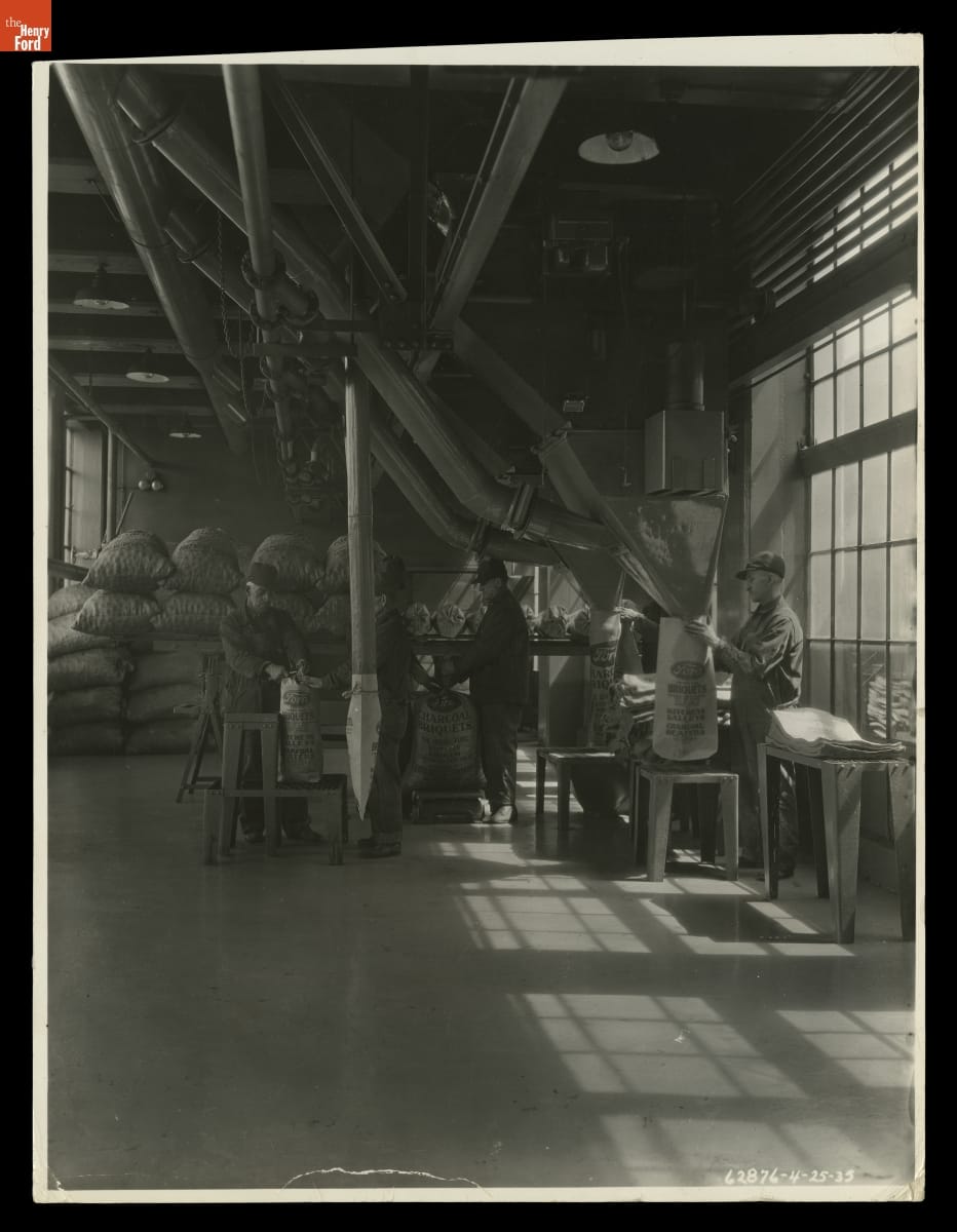 Ford Motor Company sawmills created heaps of wood wastes. Some was used to produce steam for factory operations. The rest was carbonized and compressed into charcoal. Workers mixed charred hardwood chips with starch, forming nearly 100 tons of charcoal briquettes each day. Dealers sold branded barbecue accessories and packages of the popular briquettes in Ford dealerships across the country.