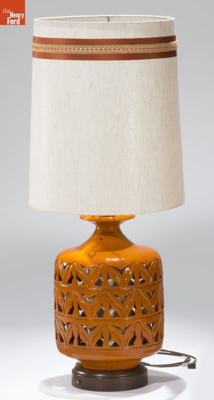 This lamp embodies the essence of 1970s middle-class taste. Its bright burnt umber base stands out -- probably competing with other boldly colored living room furnishings. The pierced and textured surface of the base lights up -- literally. Even the simple cylindrical shade with its multi-textured band and surface attracts attention -- adding more to a room filled with "more."