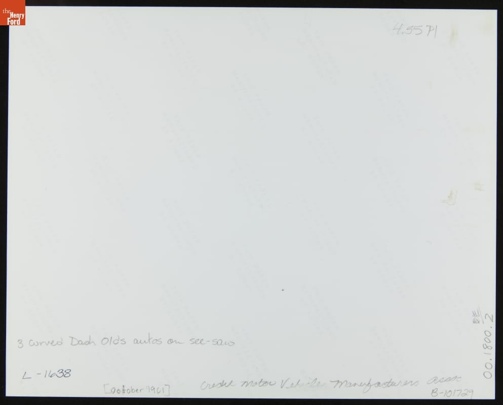 Demonstration of Three 1902 Curved Dash Oldsmobiles on a Seesaw, 1902