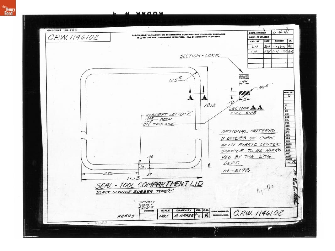 The Ford Motor Company created over a million parts drawings from 1903 to 1957. Many of these drawings specify engineering requirements for the components of Ford-made vehicles--including automobiles, trucks, tractors, military vehicles and Tri-motor airplanes. Others document assembly components, stages of casting and forging, or experimental designs. Beginning in the 1940s, Ford transferred the drawings to microfilm.