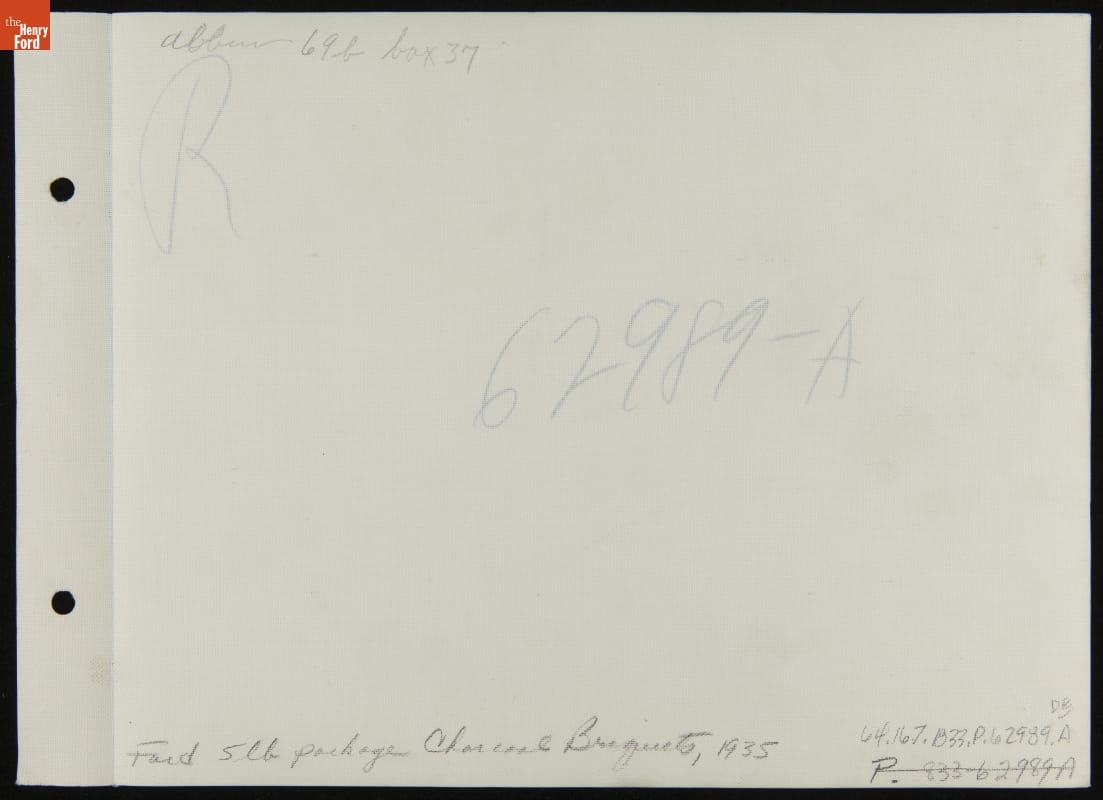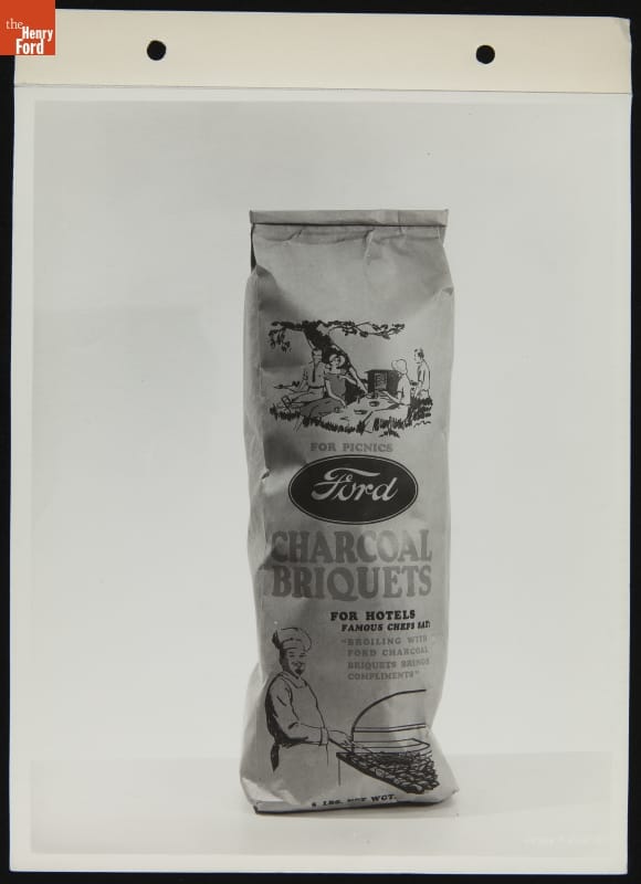 Ford Motor Company manufactured charcoal briquettes from wood wastes generated by its lumber operations in Michigan's Upper Peninsula. This packaging promotes their use as a cooking fuel for family picnics as well as commercial restaurant kitchens. Ford boasted that the hardwood used in its charcoal gave a special aroma and flavor to any foods cooked over it.