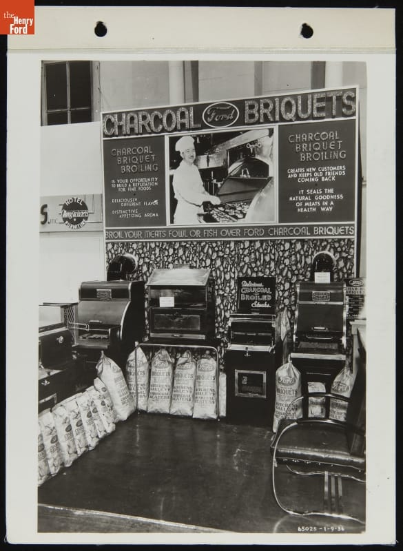 Ford Motor Company targeted commercial restaurateurs, not backyard barbeque chefs, with this booth promoting the company's charcoal briquettes. The briquettes were made from wood scraps produced by Ford's sawmill in Kingsford, Michigan. The side business in charcoal was far removed from the automotive industry, but it was perfectly in keeping with Henry Ford's desire to reduce and reuse waste.