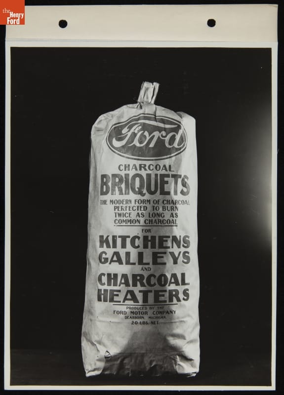 Ford Motor Company sawmills created heaps of wood wastes. Some was used to produce steam for factory operations. The rest was carbonized and compressed into charcoal. Workers mixed charred hardwood chips with starch, forming nearly 100 tons of charcoal briquettes each day. Dealers sold branded bags of the popular briquettes in Ford dealerships across the country.