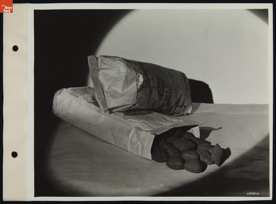 Ford Motor Company sawmills created heaps of wood wastes. Some was used to produce steam for factory operations. The rest was carbonized and compressed into charcoal. Workers mixed charred hardwood chips with starch, forming nearly 100 tons of charcoal briquettes each day. Dealers sold branded bags of the popular briquettes in Ford dealerships across the country.