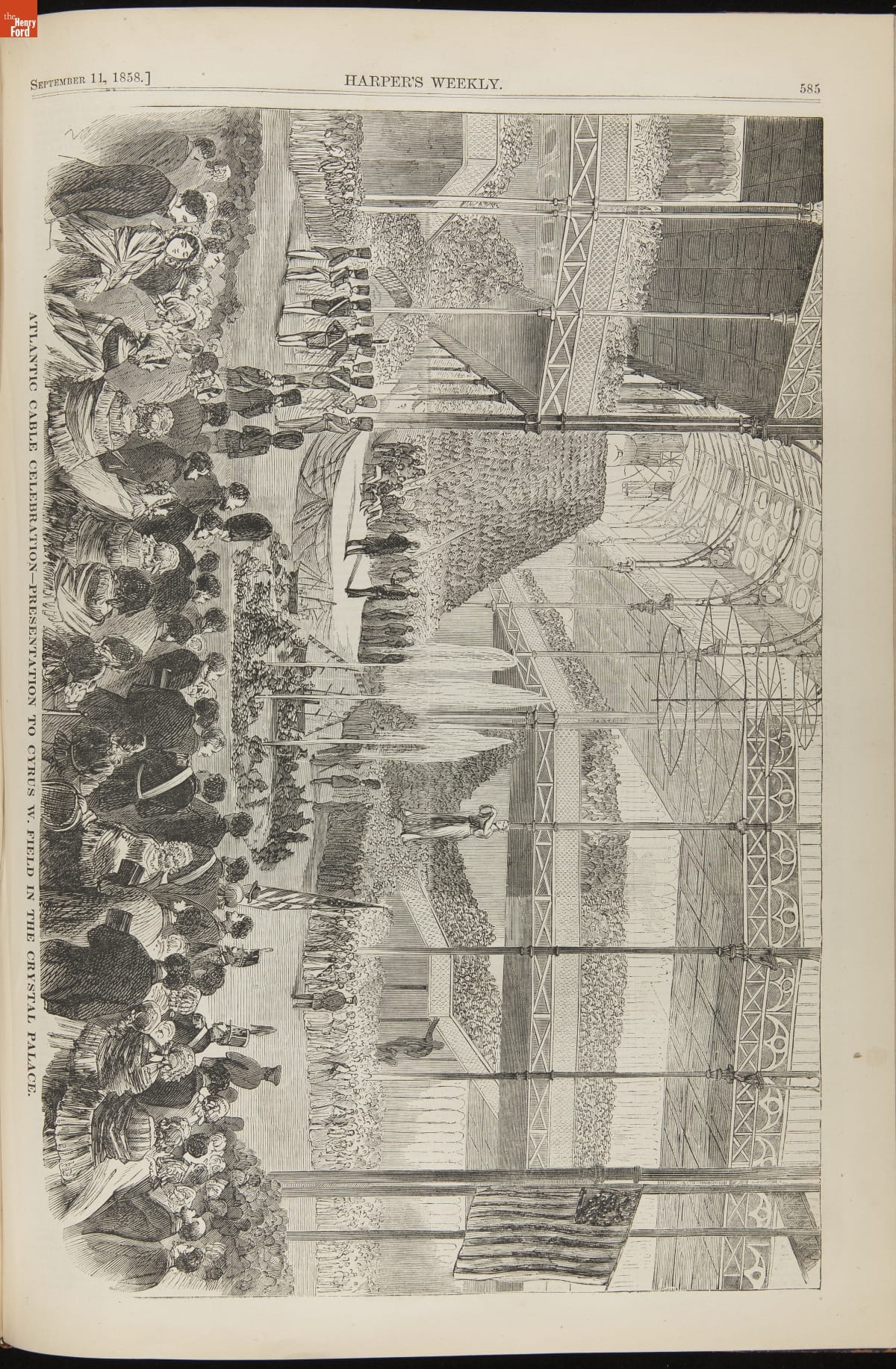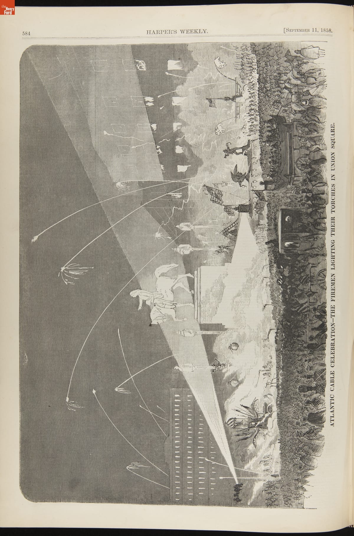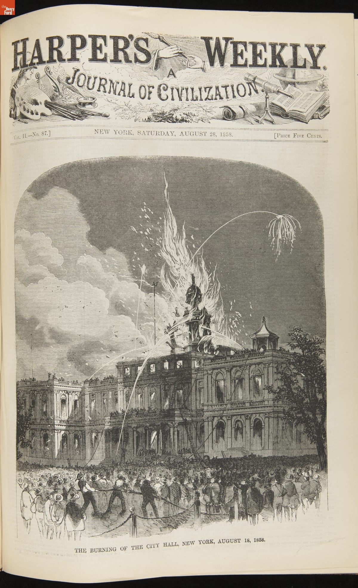 This periodical shows a fire at New York City Hall on August 18, 1858. To celebrate the successful transmission of messages over the transatlantic cable September 1 was declared as an "International Cable Jubilee" day. New York City began its commemorations early, setting off a display of fireworks. Sparks ignited the dome of City Hall, destroying part of the building.