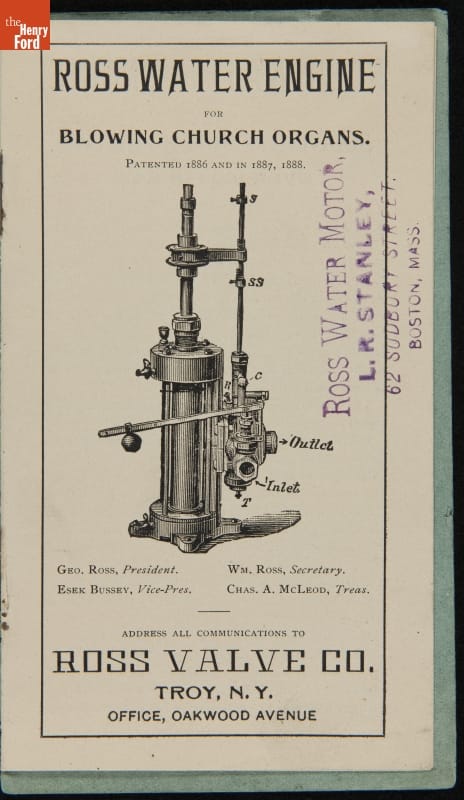 "Ross Water Engine for Blowing Church Organs," circa 1893