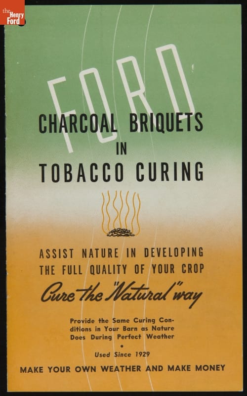 Ford Motor Company's charcoal briquettes were good for more than just backyard cookouts. This brochure promoted their use to aid in the proper curing of tobacco. The briquettes, according to the text, produced a dry, even heat that removed moisture from tobacco leaves slowly and steadily. With Ford briquettes, farmers could "make their own weather" and ensure a perfect crop.