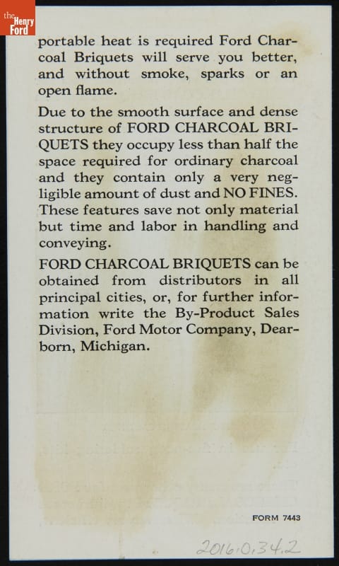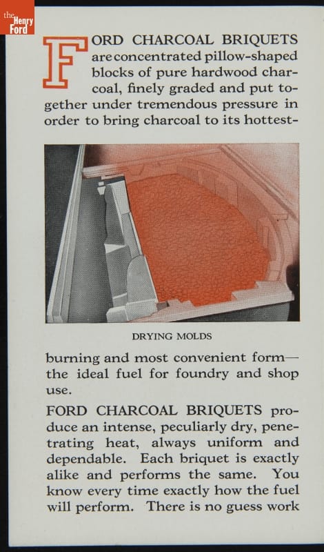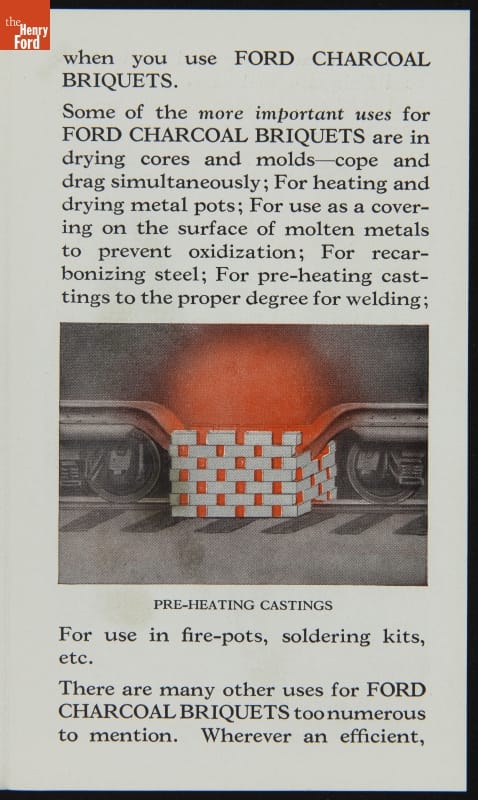 Ford Motor Company's charcoal briquettes were good for more than just backyard cookouts. This brochure promoted their use as an industrial fuel. The briquettes' dry and even heat, according to the text, made them ideal for drying casting cores and molds, for covering molten metals to prevent oxidation, and for pre-heating castings prior to welding.