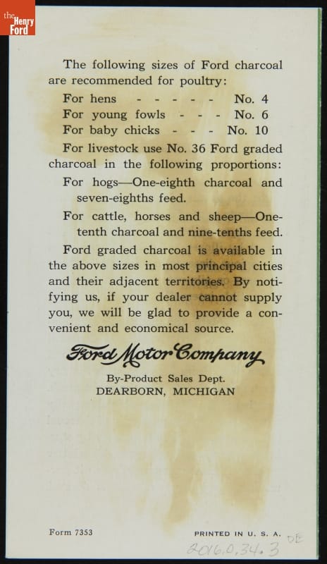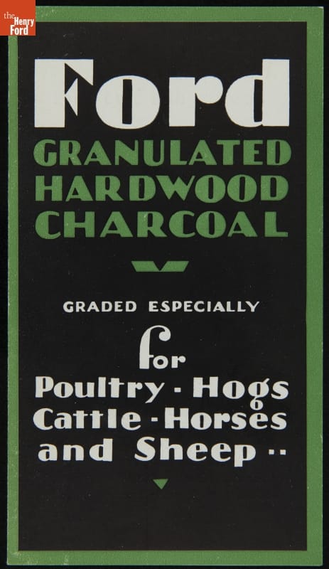"Ford Granulated Hardwood Charcoal for Poultry, Hogs, Cattle, Horses and Sheep," 1935-1940