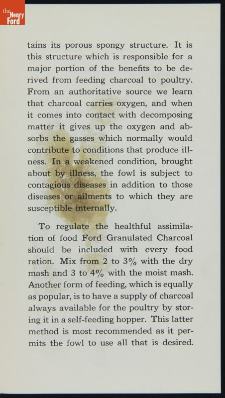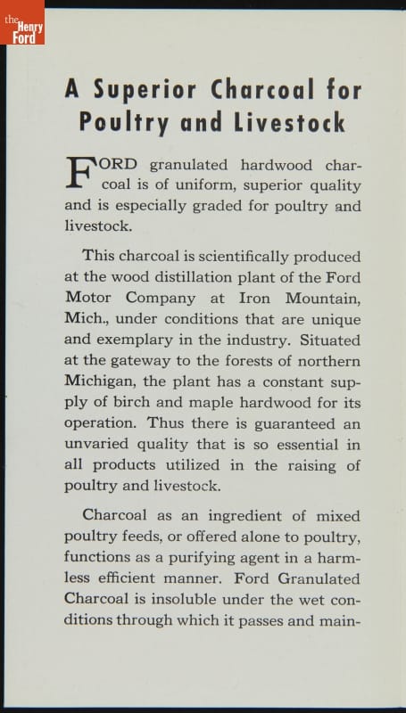 Ford Motor Company's charcoal briquettes were good for more than just backyard cookouts. This brochure promoted their use as a feed supplement for poultry and livestock. According to the text, Ford charcoal had a purifying effect in animals' digestive systems, absorbing gases that might otherwise make them susceptible to illness. Ford recommended charcoal for hens, chicks, hogs, cattle, horses, and sheep.