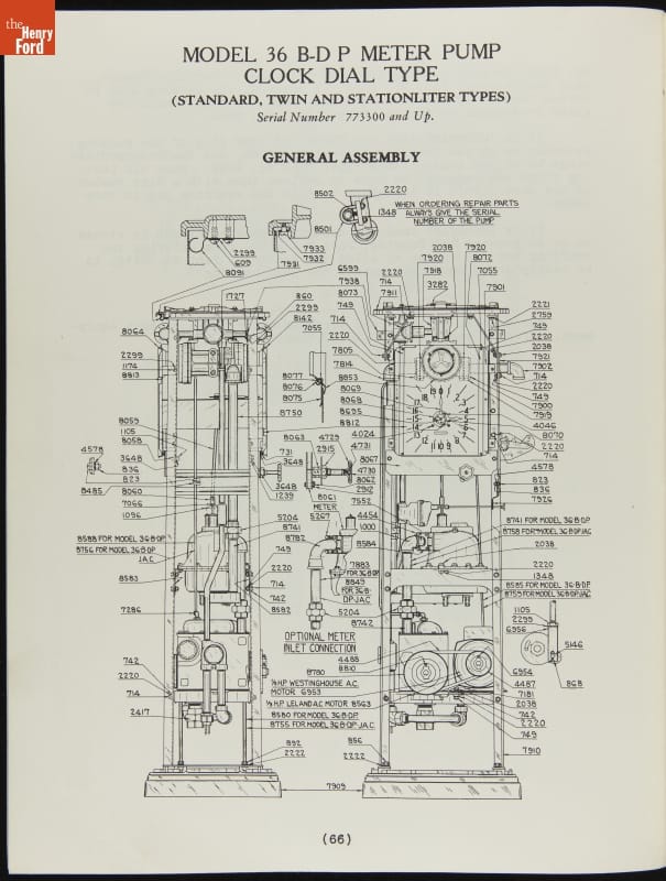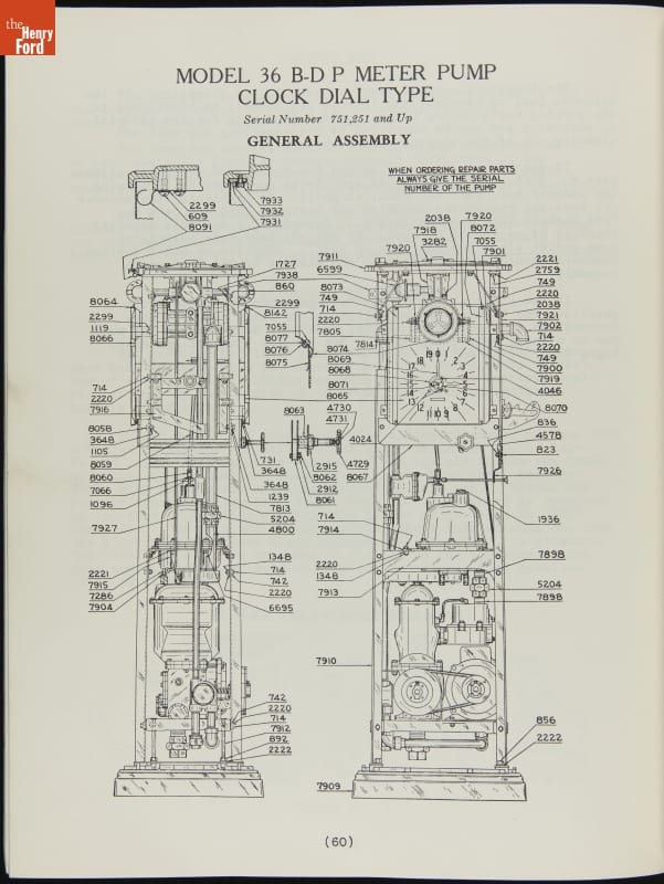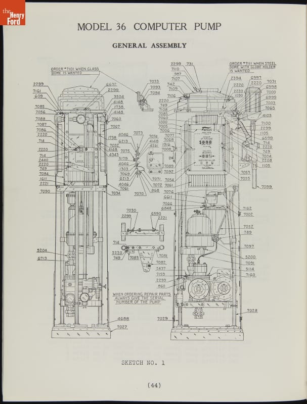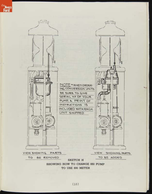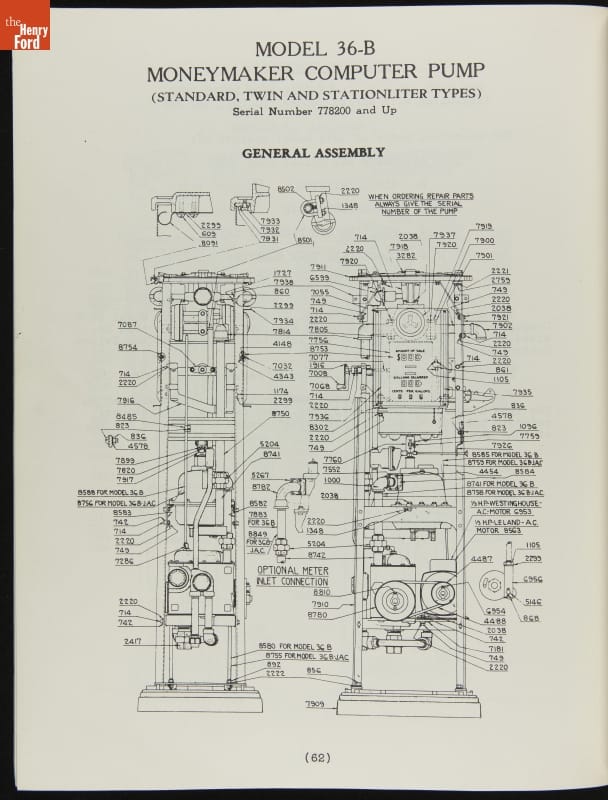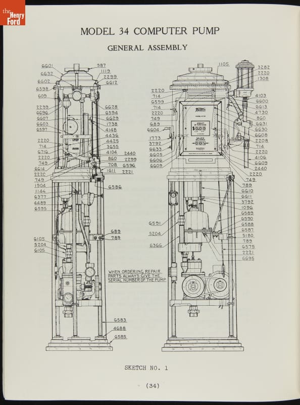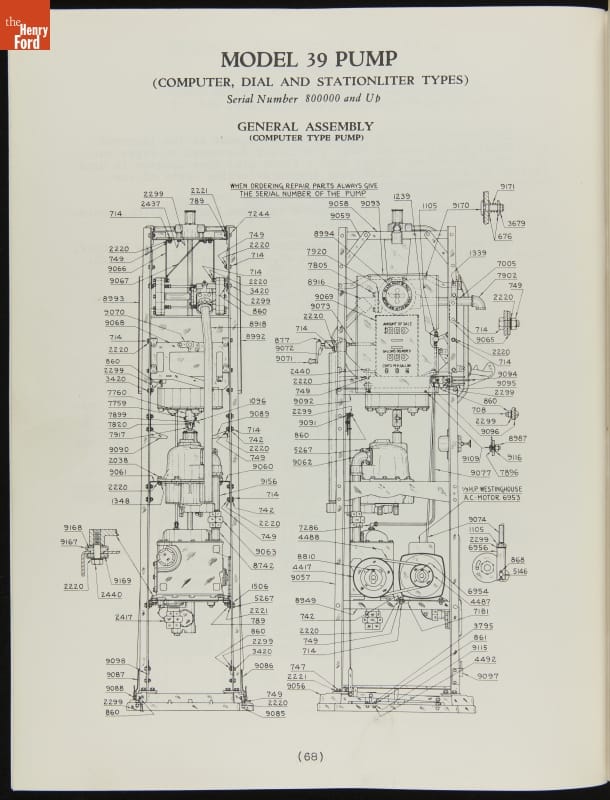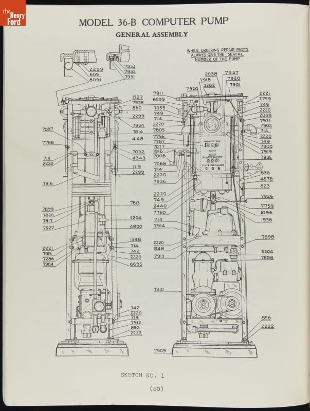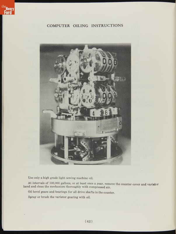 The first calculating gasoline pumps, capable of measuring the quantity of fuel dispensed as well as calculating the sale price, appeared in 1933. These service instructions from pump manufacturer Tokheim include directions for both clock face dials and reeled number displays. The pumps, particularly the Model 36 on page 44, show strong art deco design influences.