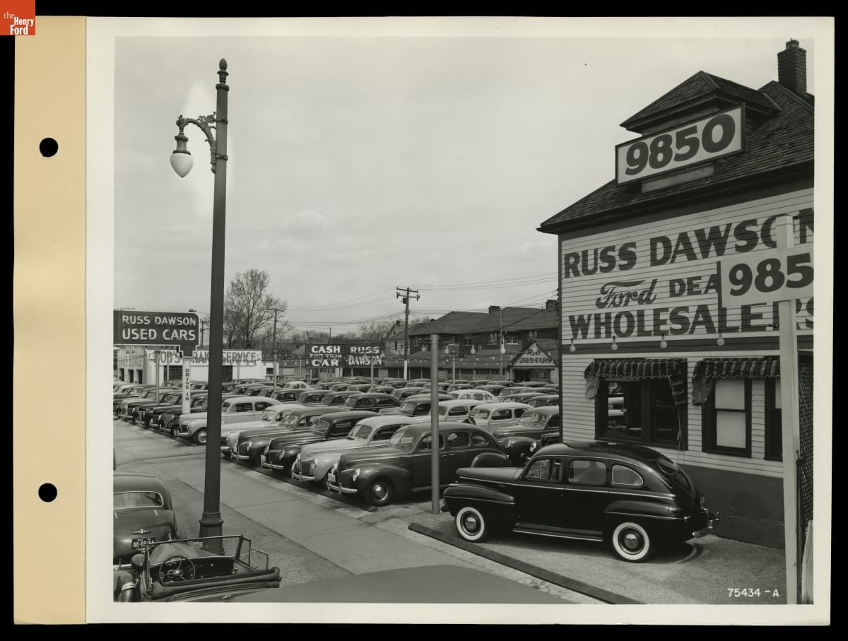 This photograph was taken at the Russ Dawson Ford Dealership in Highland Park, Michigan, near Detroit. The business sold new and used cars, and it had an extensive parts department and service garage as well. Used cars benefited customers who could buy fancier pre-owned vehicles for the price of new economy models, and they expanded a dealership's customer base.