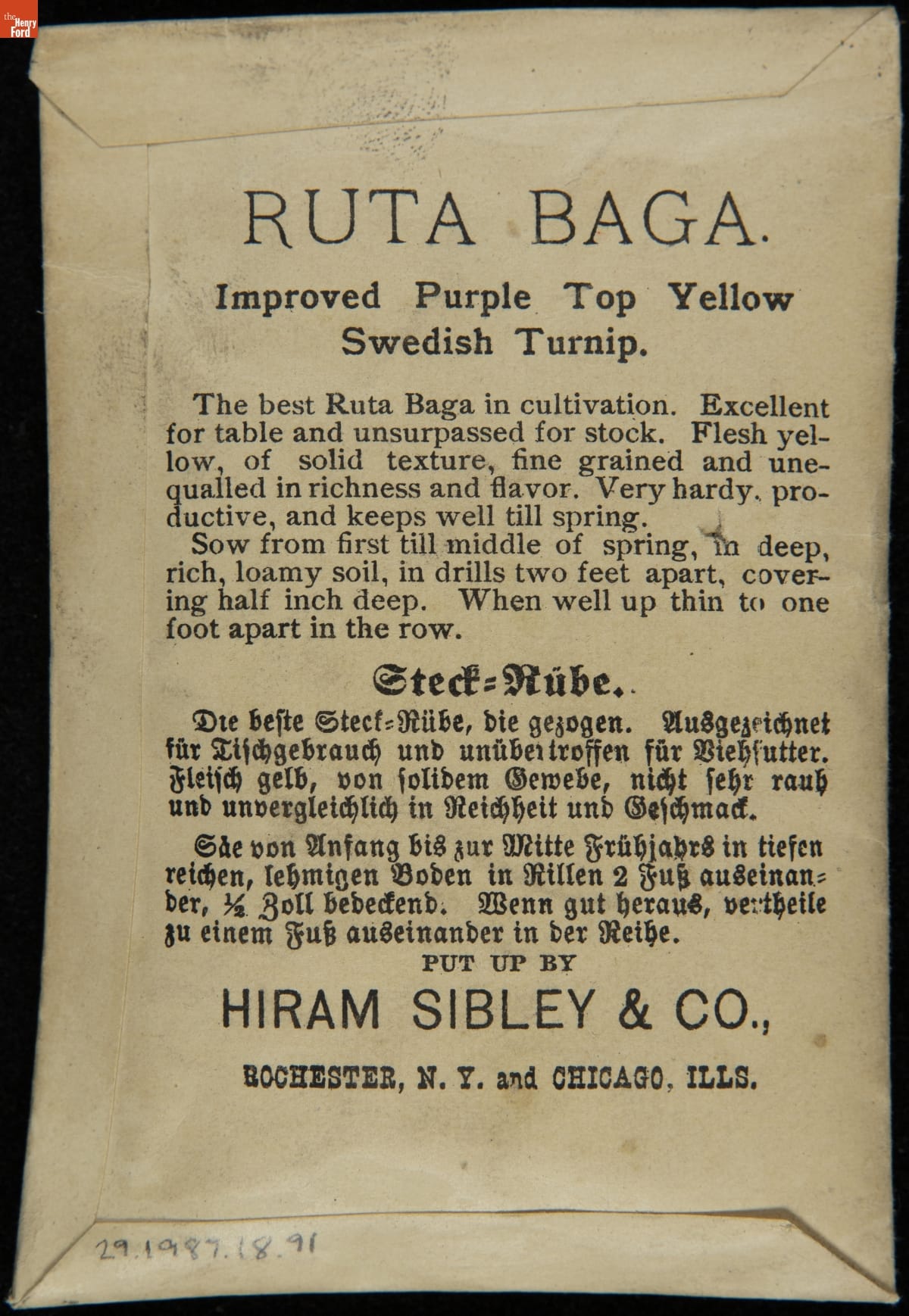 on front: RUTABAGA / IMPROVED PURPLE TOP YELLOW / SWEDISH TURNIP / SEND FOR OUR ILLUSTRATED CATALOGUE... / HIRAM SIBLEY & CO. / ROCHESTER, N.Y. & CHICAGO, ILL.
