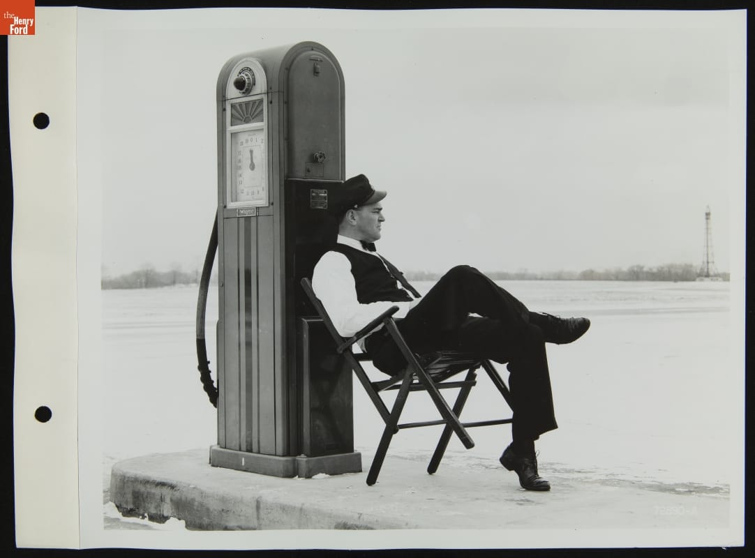 Gas Station Attendant Seated at Fuel Pump, 1940