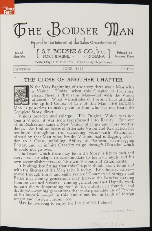 "The Bowser Man, Dedication of Bowser's Millionth Self-Measuring Pump," June 1923