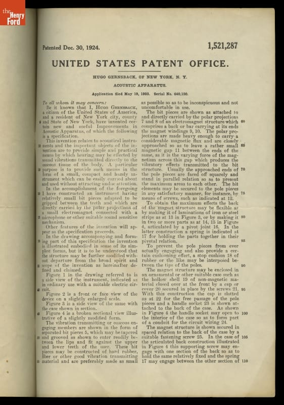 U.S. Patent 1,521,287 for the Acoustic Apparatus (Osophone), Granted to Hugo Gernsback December 30, 1924