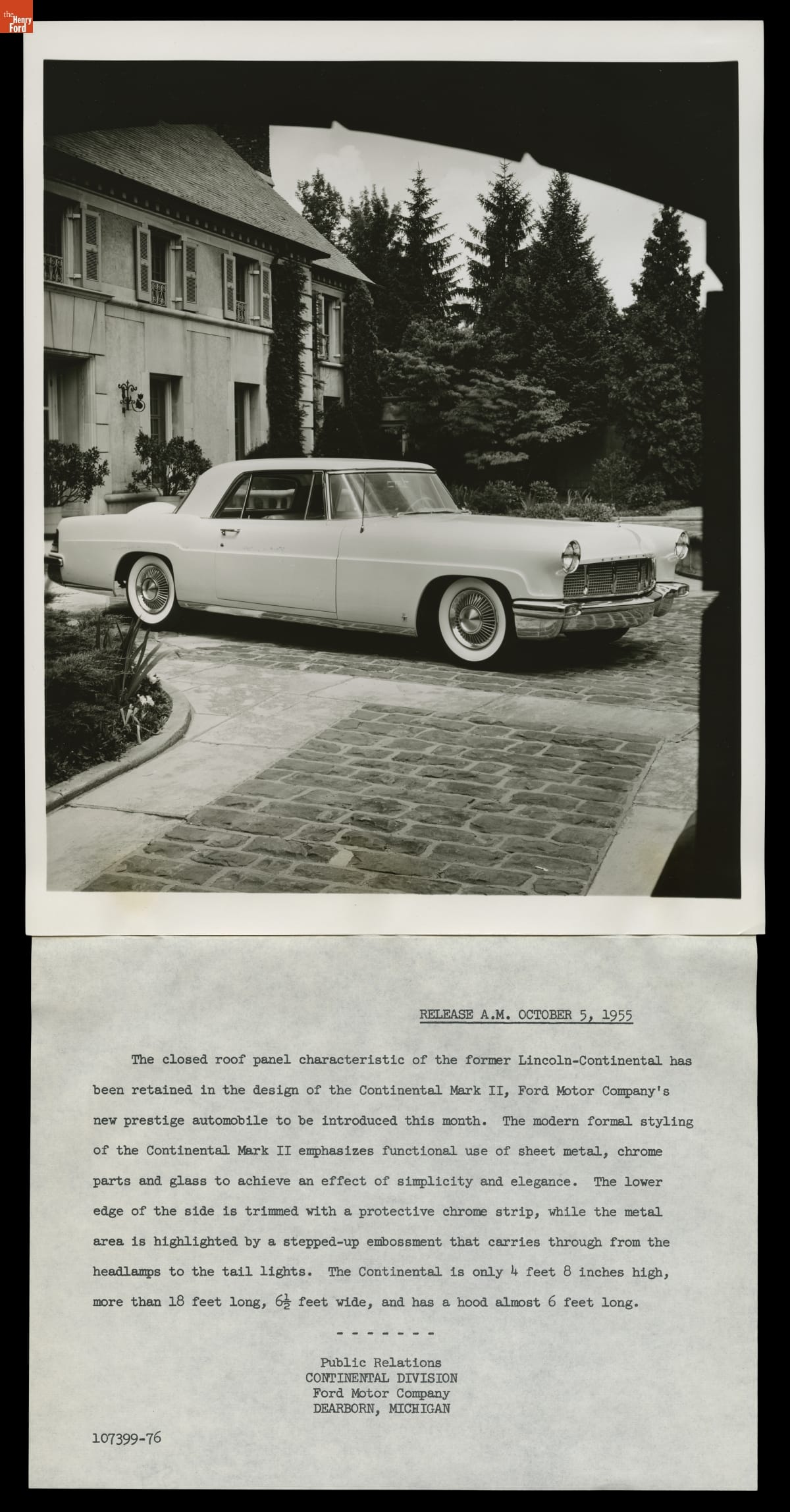 October 5, 1955 / The closed roof panel characteristic of the former Lincoln-Continental has been retained in the design of the Continental Mark II, [...] /...chrome parts and glass to achieve an effect of elegance. [...] / Public Relations CONTINENTAL DIVISION / Ford Motor Company / [...]