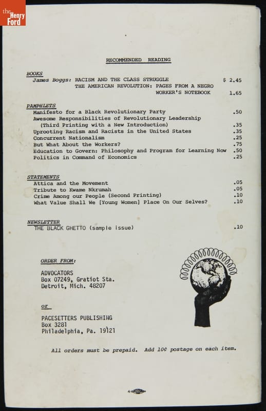 Written by James Boggs and James Hocker. Published by Advocators in Detroit, Michigan and Pacesetters Publishing in Philadelphia, Pennsylvania.