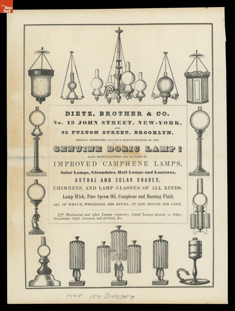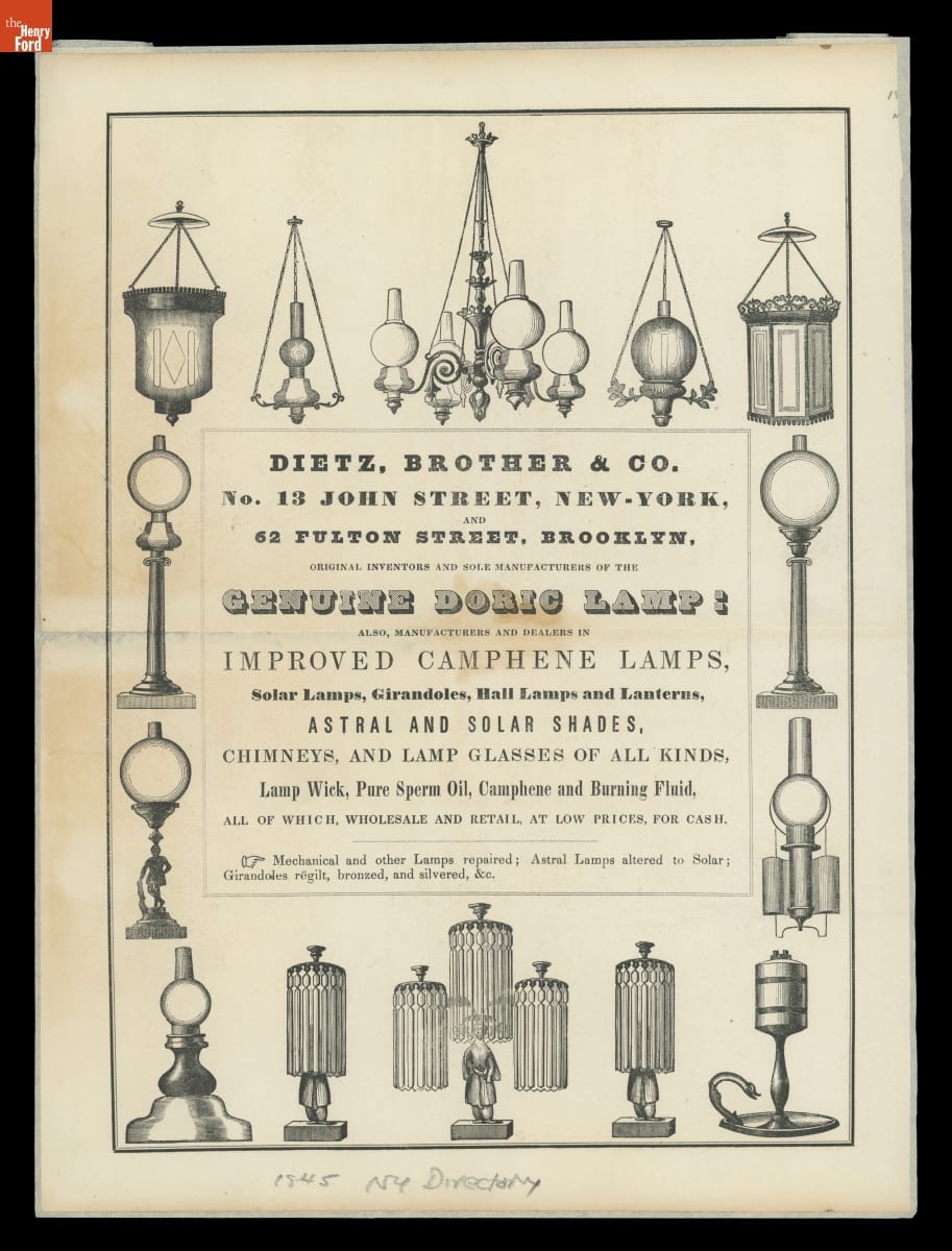 Advertisement for Dietz, Brother & Co. Genuine Doric Lamp, 1845