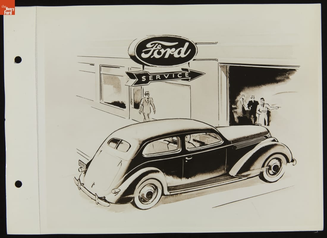 Drawing of Ford V-8 Car Entering Ford Service Garage, Produced for Direct Mail, January 1937