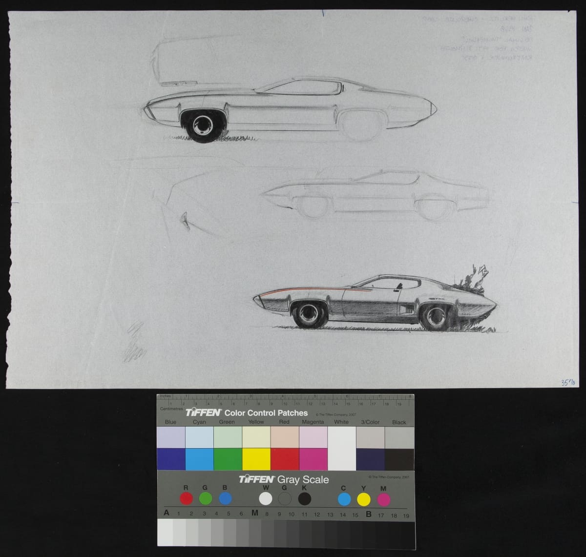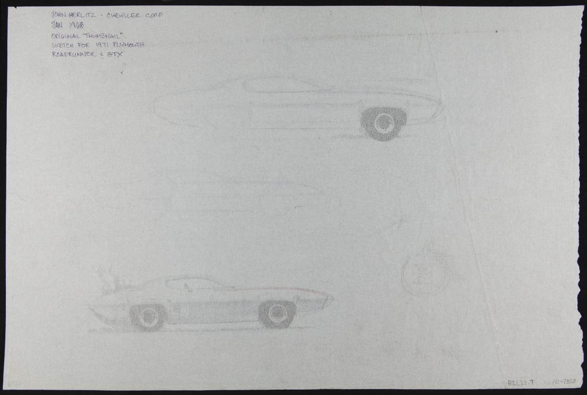 lower front corner, handwritten: 3570 upper back corner, handwritten: JOHN HERLITZ - CHRYSLER CORP / JAN 1968 / ORIGINAL "THUMBNAIL" / SKETCH FOR 1971 PLYMOUTH / ROADRUNNER & GTX