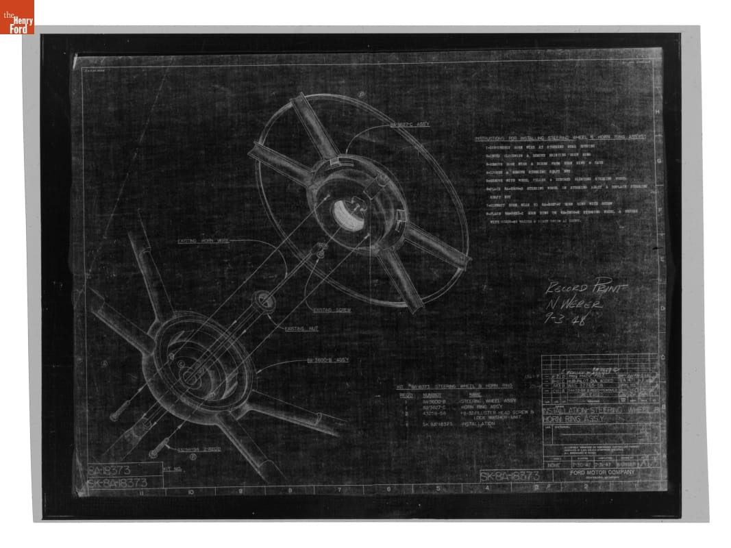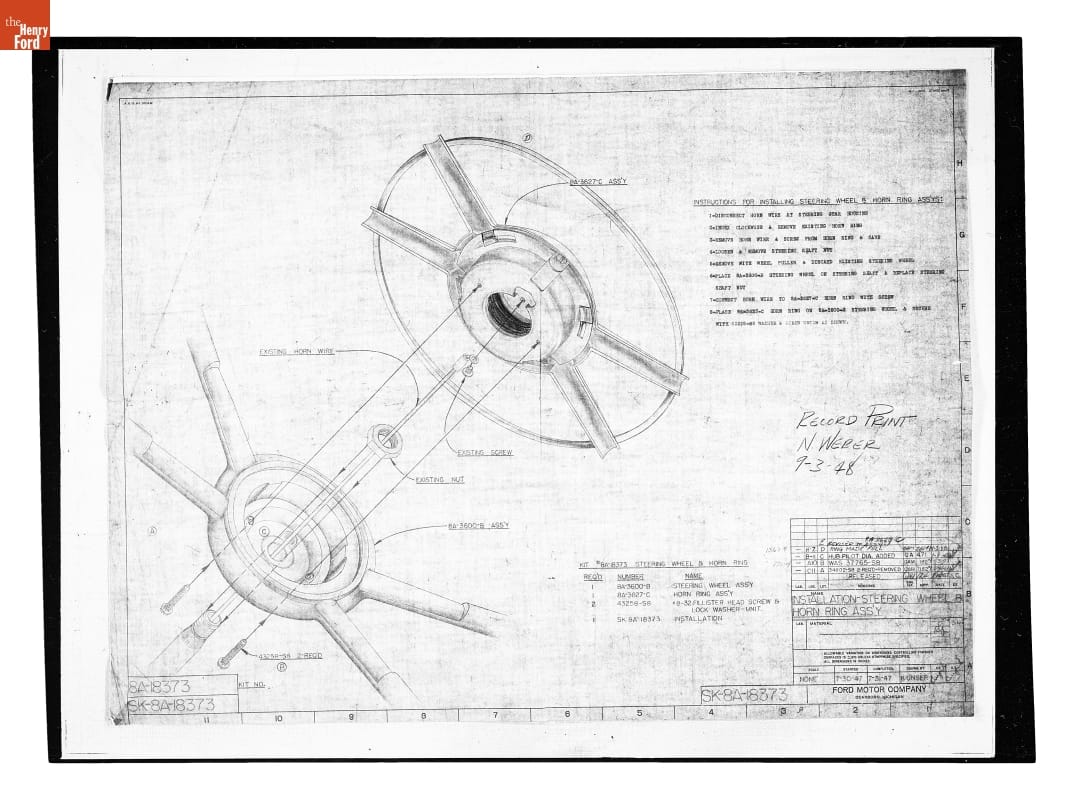 Drawing, "Installation - Steering Wheel & Horn Ring Ass'y," Ford Automobile, September 3, 1948