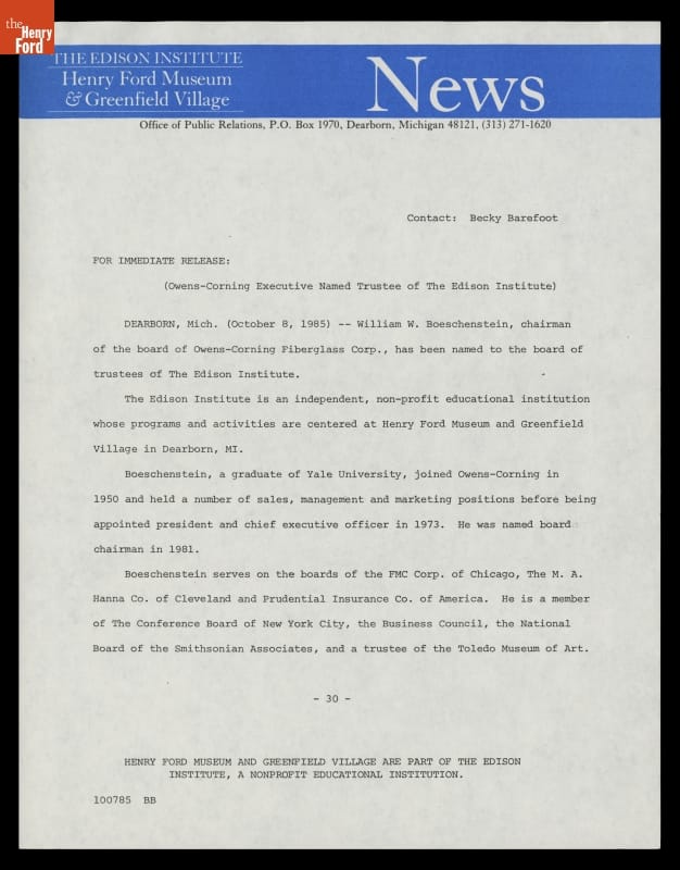 Press Release, "Owens-Corning Executive Named Trustee of The Edison Institute," October 8, 1985