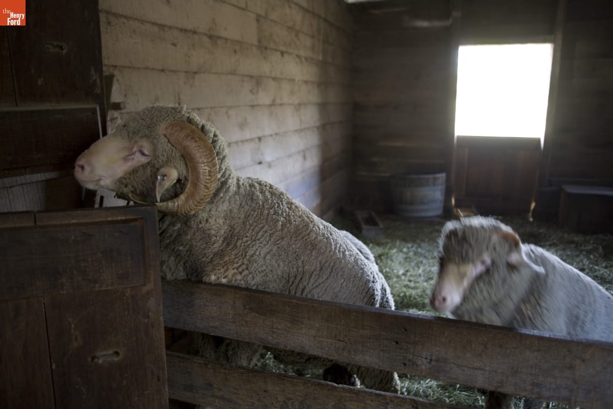Firestone Farm in Greenfield Village is a "living history" re-creation of what life was like on the Ohio farm of Benjamin and Catherine Firestone in 1885. The Firestone's raised Merino sheep, a popular breed selectively bred during the 1800s to produce wrinkly skin. The Merinos' wrinkly skin yielded more wool--and profit. This image from 2007 shows some of our Merino sheep.