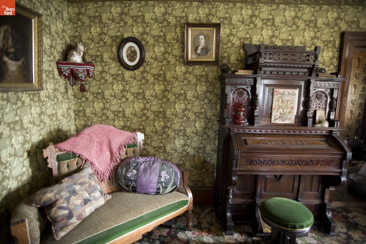 Firestone Farm in Greenfield Village is a "living history" re-creation of what life was like on the Ohio farm of Benjamin and Catherine Firestone in 1885. Meticulous research went into furnishing the farmhouse after its move to Greenfield Village. This image from 2007 shows some of the original family furnishings and other carefully selected period and reproductions items visitors to the reconstructed house encountered.