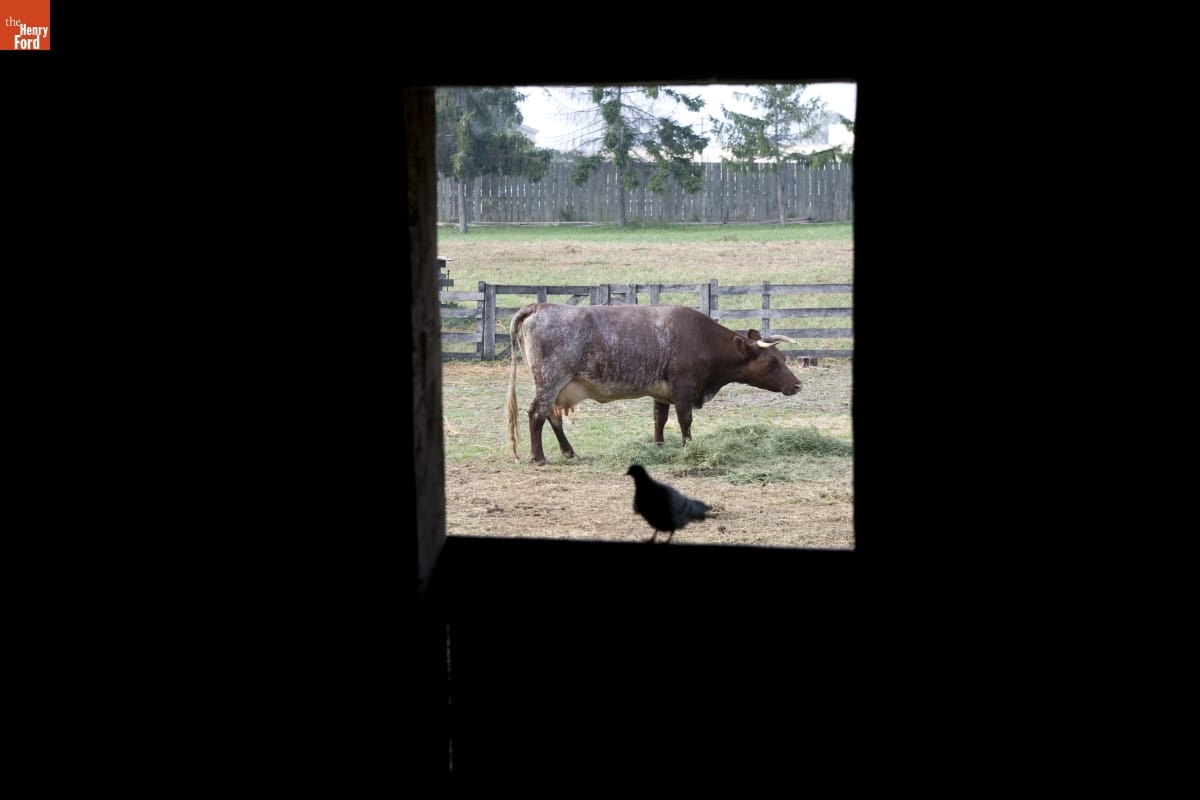 Firestone Farm in Greenfield Village is a "living history" re-creation depicting what life was like on the Ohio farm of Benjamin and Catherine Firestone in 1885. Part of this experience includes seeing farm animals typical of this era. Cows provided meat, milk, butter, and other dairy products that the Firestone family consumed.