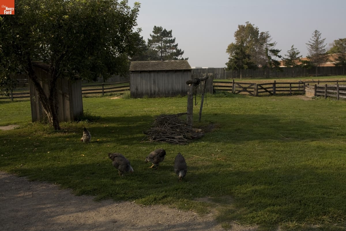 Firestone Farm in Greenfield Village is a "living history" re-creation of what life was like on the Ohio farm of Benjamin and Catherine Firestone in 1885. Part of this experience includes seeing farm animals typical of this era. Chickens could be found strutting around the yard looking for food. Their eggs provided food for the family and ready cash when sold at local markets.