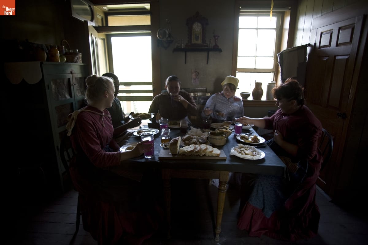 Firestone Farm in Greenfield Village is a "living history" re-creation of what life was like on the Ohio farm of Benjamin and Catherine Firestone in 1885. In this image from 2007, historical presenters in period clothing sit down for a midday meal consisting of seasonal foods prepared using authentic recipes from the era.