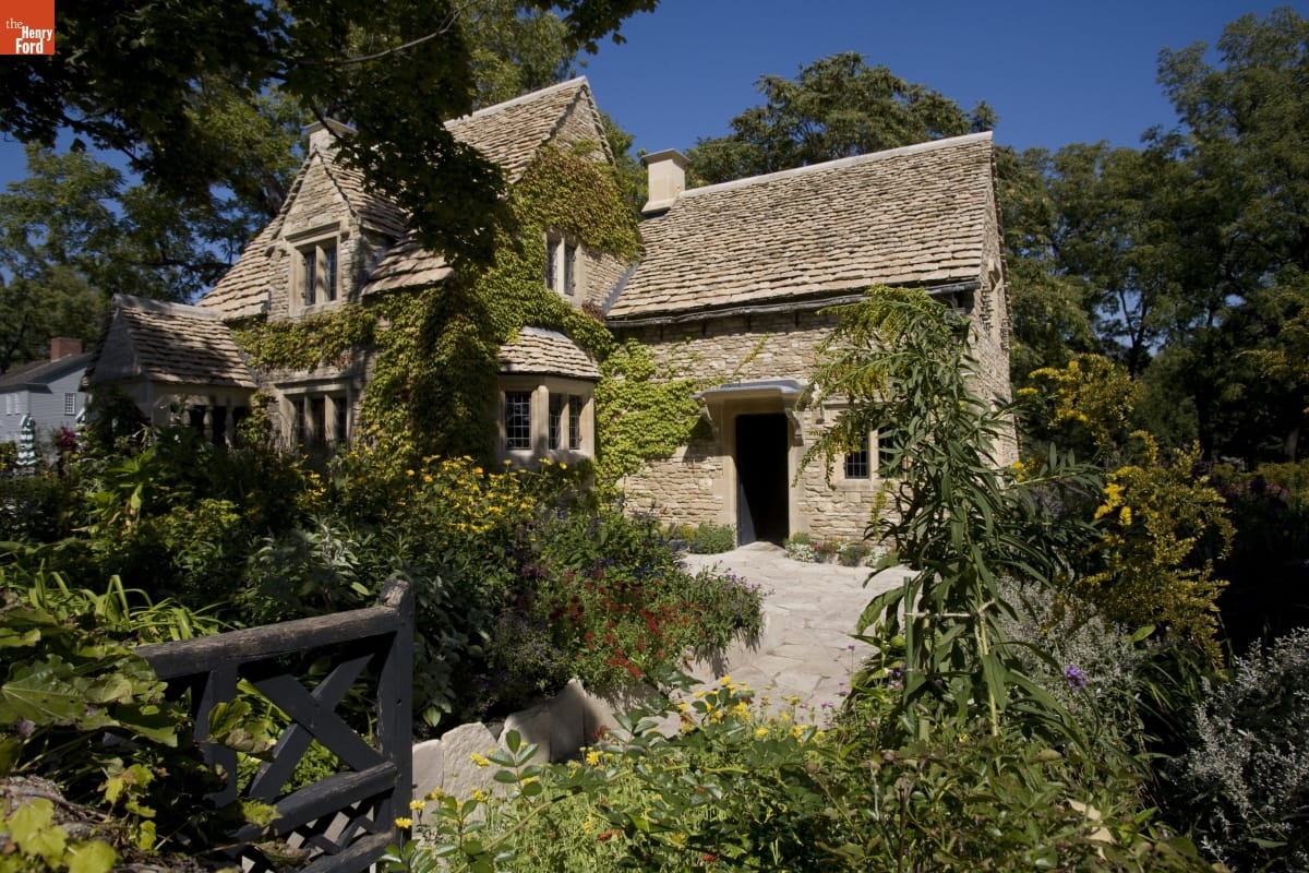 Cotswold Cottage is from the Cotswold Hills in southwest England. The Fords were attracted to the distinctive character of Cotswold buildings, which are characterized by the yellow-brown stone, tall gables, steeply pitched roofs, and stone ornamentation around windows and doors. Several decorative additions were made to the house in England, before dismantling and re-erecting it in Greenfield Village.