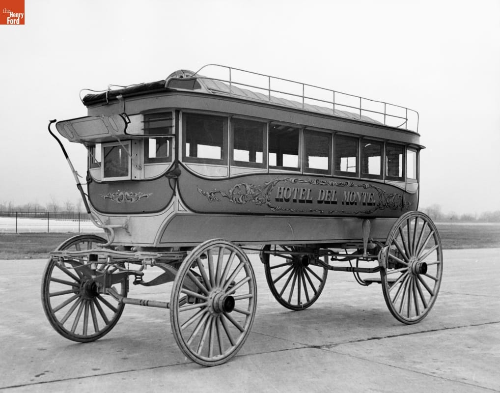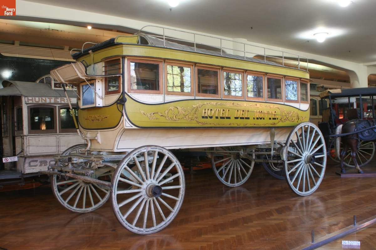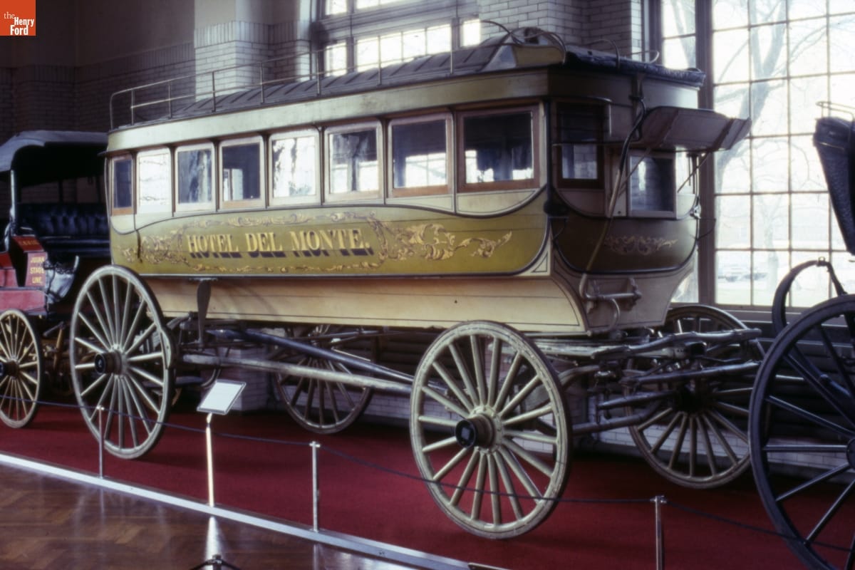 American cities used horse-drawn omnibuses for public transportation from the 1830s into the 1910s. Passengers entered through a rear door and sat on seats that ran lengthwise along each side. Larger hotels, like the fashionable Hotel Del Monte in Monterey, California, used omnibuses to transport guests between railroad station and hotel, or on special excursions during their stay.
