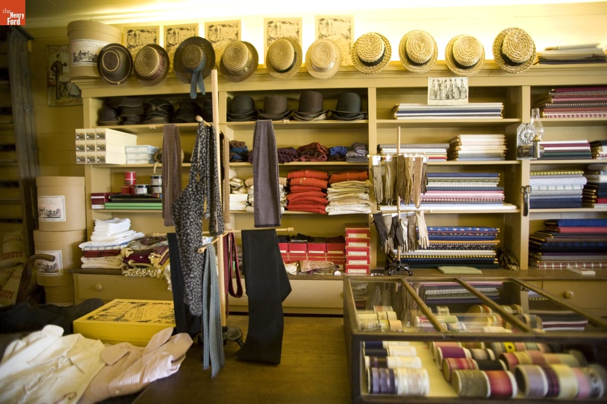 This store, originally located in Waterford, Michigan, was the first building Henry Ford brought to Greenfield Village. From 1882 to 1888, storekeeper J.R. Jones sold products like coffee, sugar, fabric, and shoes here. The right side of the store is stocked with men's ready-made clothing, clothing accessories, hats, fabrics, and sewing notions.