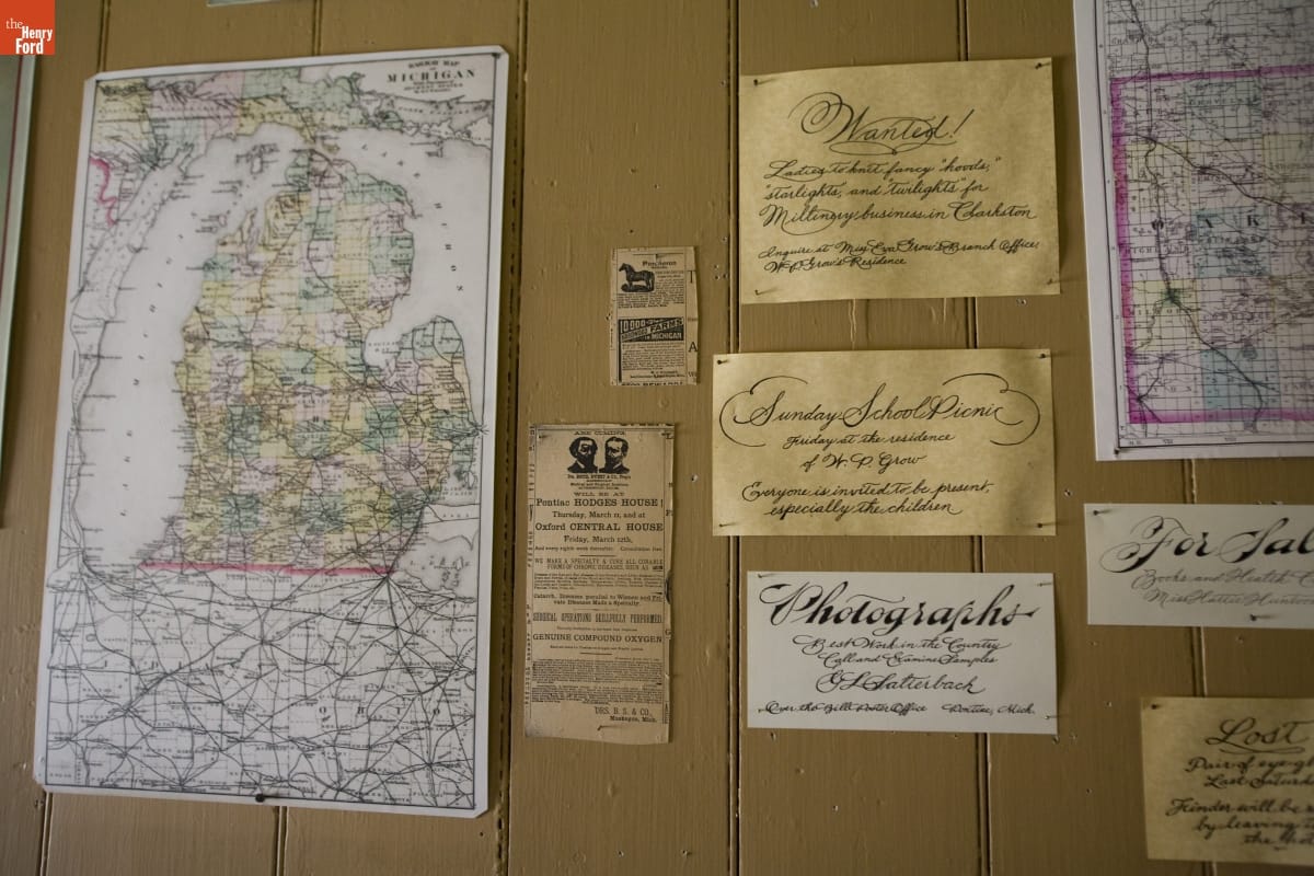 This store, originally located in Waterford, Michigan, was the first building Henry Ford brought to Greenfield Village. From 1882 to 1888, storekeeper J.R. Jones sold products like coffee, sugar, fabric, and shoes here. The back, right wall of the store contains notices that members of the local community might have found of interest.