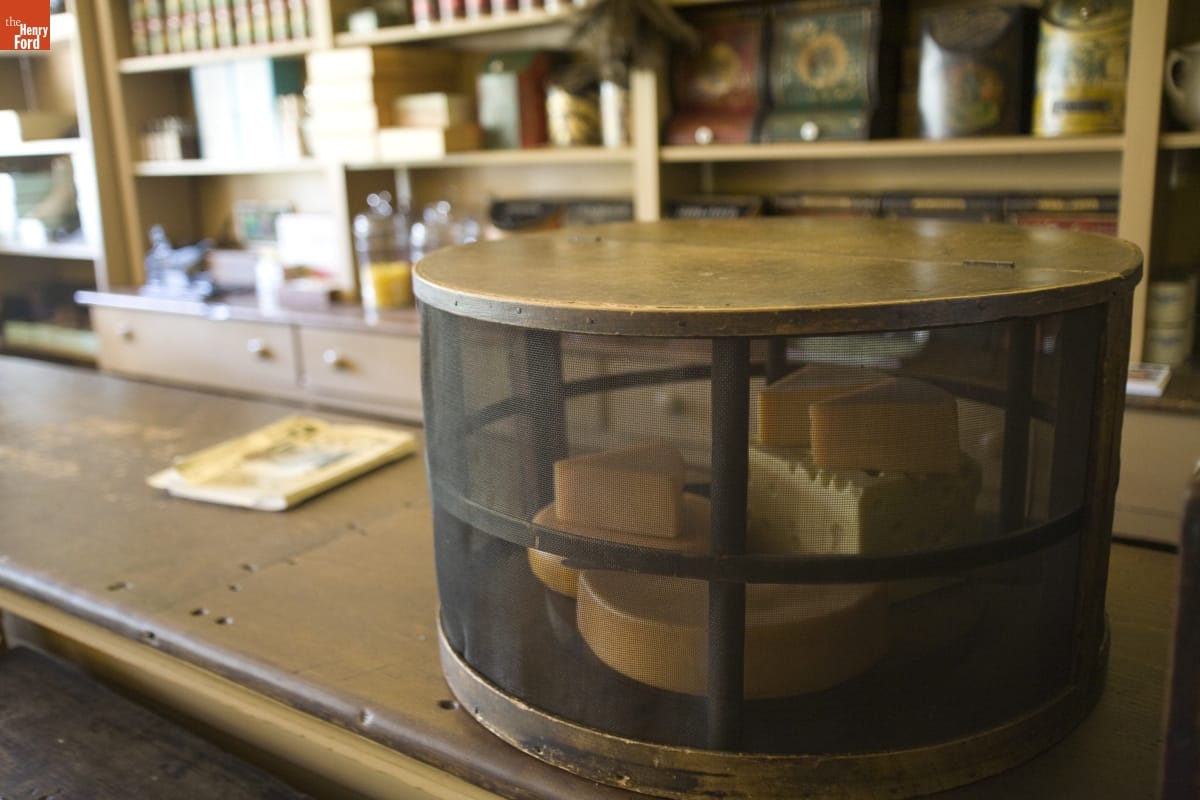 This store, originally located in Waterford, Michigan, was the first building Henry Ford brought to Greenfield Village. From 1882 to 1888, storekeeper J.R. Jones sold products like coffee, sugar, fabric, and shoes here. The grocery "department" on the left side of the store included a selection of cheeses in the cheese "safe." The safe kept out flies and vermin.