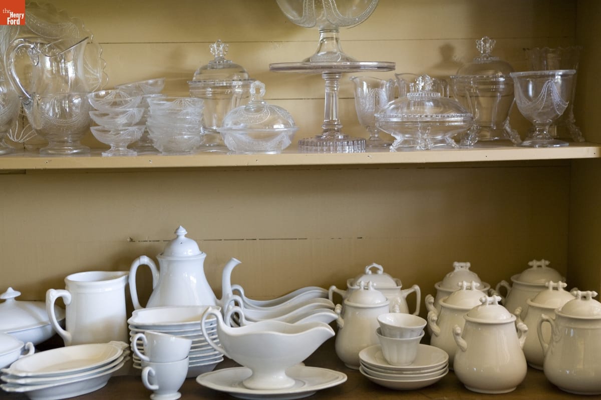 This store, originally located in Waterford, Michigan, was the first building Henry Ford brought to Greenfield Village. From 1882 to 1888, storekeeper J.R. Jones sold products like coffee, sugar, fabric, and shoes here. A large selection of tableware includes a range of styles, types, and costs for the wants and needs of different customers.
