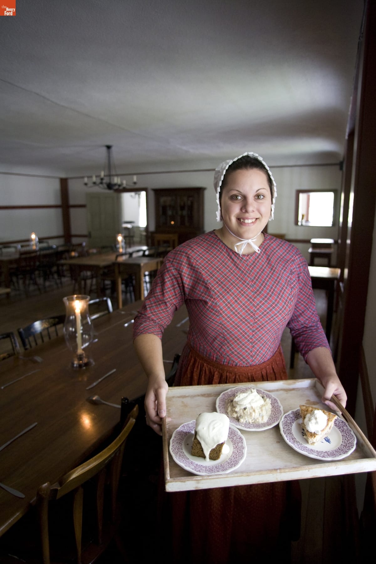 Today, the Henry Ford staff provides visitors with an authentic dining experience at Eagle Tavern--a 19th-century roadside waystation brought to Greenfield Village by Henry Ford in 1927. Cooks prepare bills-of-fare based on historical recipes and wait staff in period-appropriate dress serve the meals. This image documents the 2007 guest experience.