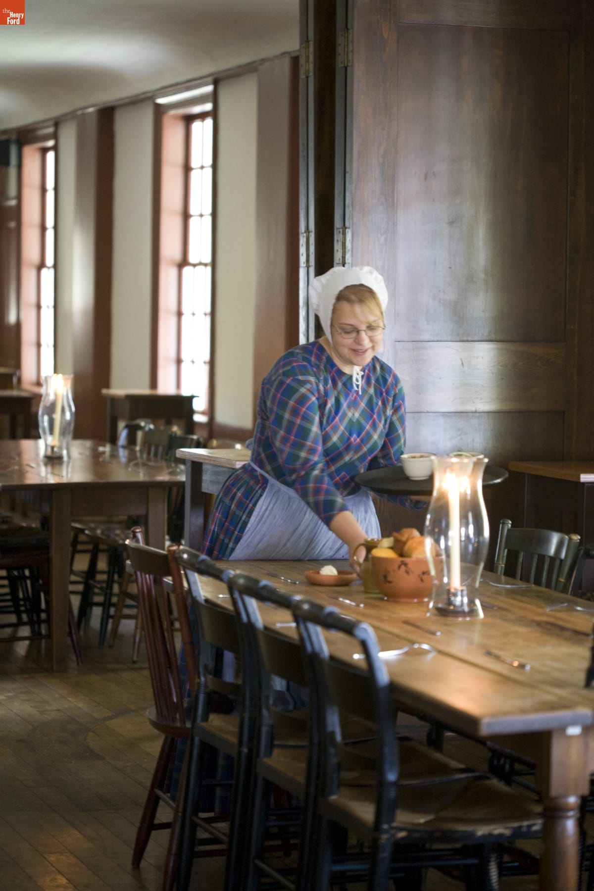 Today, the Henry Ford staff provides visitors with an authentic dining experience at Eagle Tavern--a 19th-century roadside waystation brought to Greenfield Village by Henry Ford in 1927. Cooks prepare bills-of-fare based on historical recipes and wait staff in period-appropriate dress serve the meals. This image documents the 2007 guest experience.
