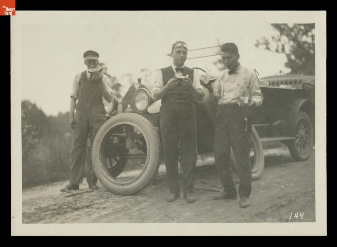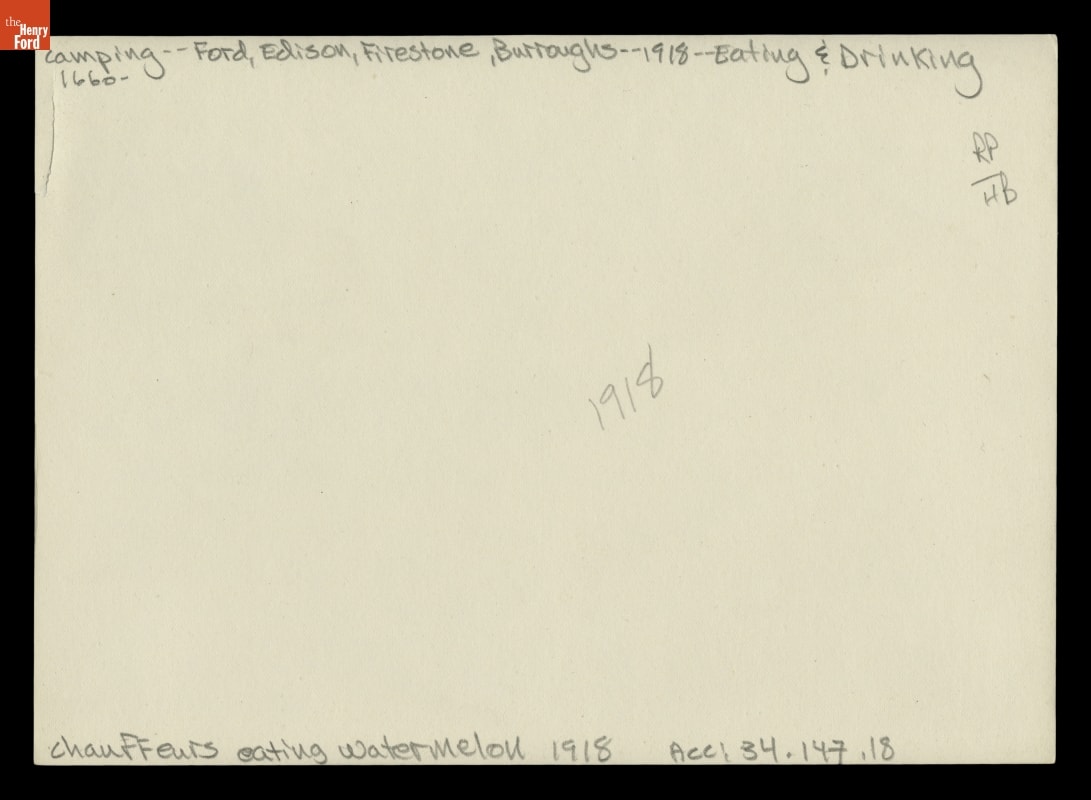 Henry Ford, Thomas Edison, Harvey Firestone, and John Burroughs embarked on many camping trips between 1916 and 1924. They called themselves the Vagabonds, yet they brought along numerous support staff to maintain camp. Pictured here, crew members Harry Linden, R.V. Kline, and Thomas Sato snack on watermelon given to the camping party by local residents in Jonesborough, Tennessee.