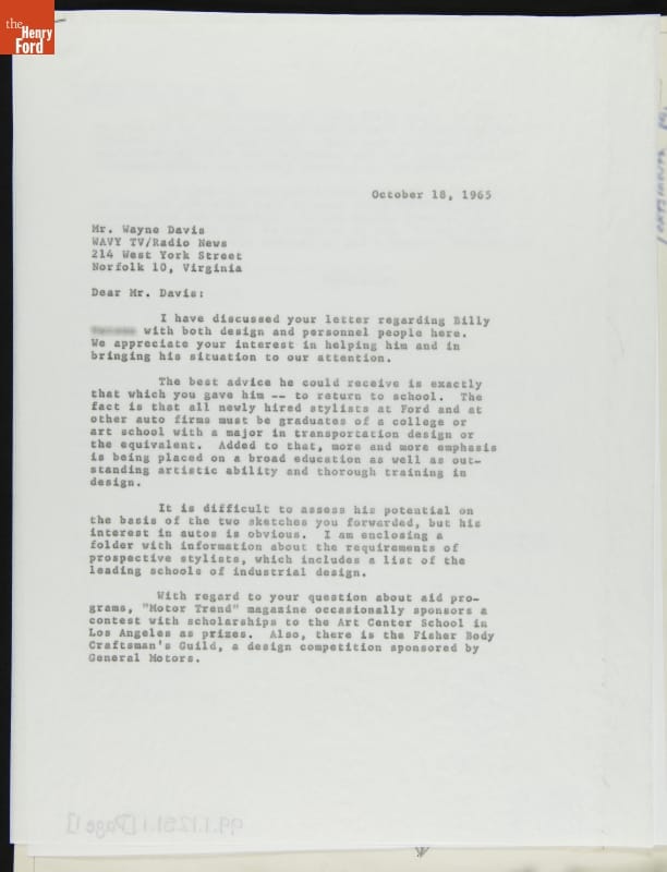 Letter from Ford Motor Company to Wayne Davis regarding a Boy's Interest in Automotive Design, October 1965