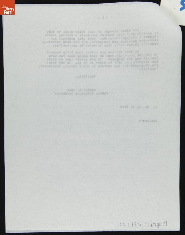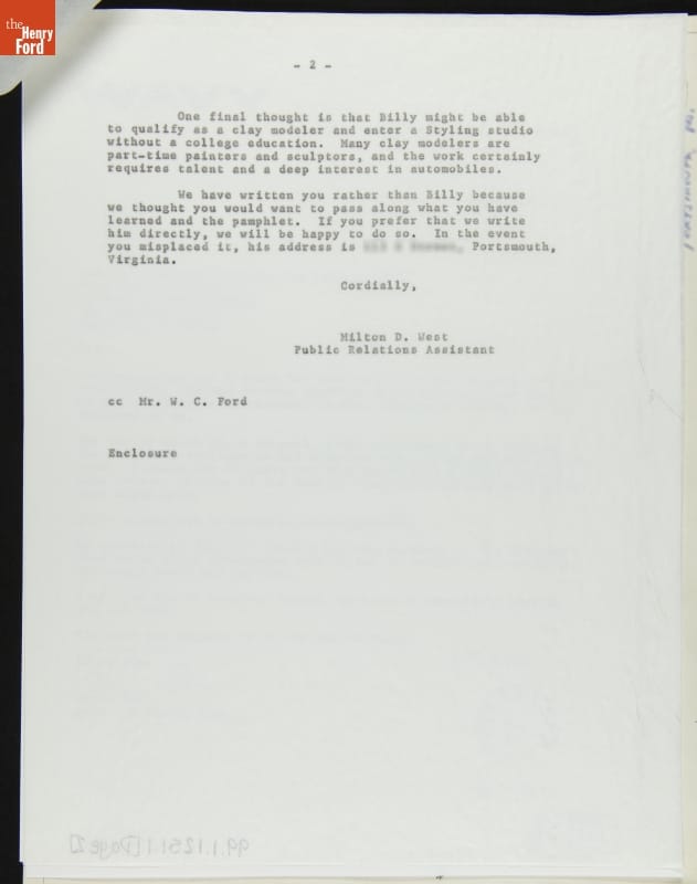 Young people seeking careers in the automotive industry might write to car companies for advice. This letter, a reply from Ford Motor Company to someone mentoring a young man in Virginia, offers advice on schooling and financial aid. Interestingly, one of the aid programs mentioned is the Fisher Body Craftsman's Guild -- an initiative of Ford's crosstown rival General Motors.
