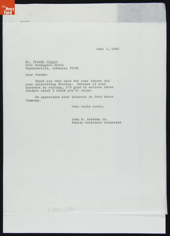 Letter of Thanks from Ford Motor Company Public Relations to Freddy, Age 8, 1966