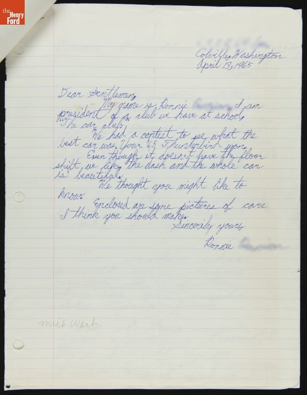 Letter from Ronnie and His Car Club to Ford Motor Company regarding the 1965 Thunderbird, April 1965
