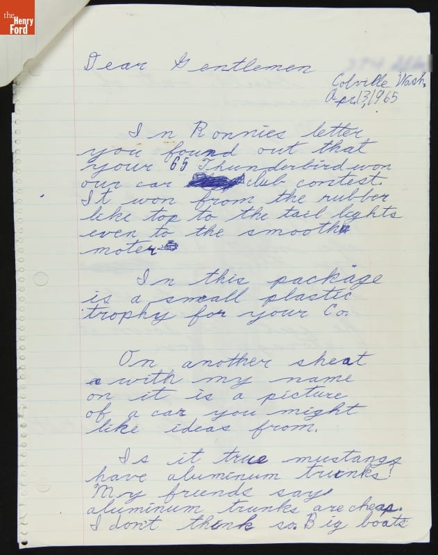 In 1965, three members of "The Car Club" of Colville, Washington, wrote to Ford Motor Company to report that they had voted Thunderbird their best car of the year. The young enthusiasts even sent drawings of cars and a small plastic trophy. In reply, they received a letter of appreciation from Ford design head Gene Bordinat.