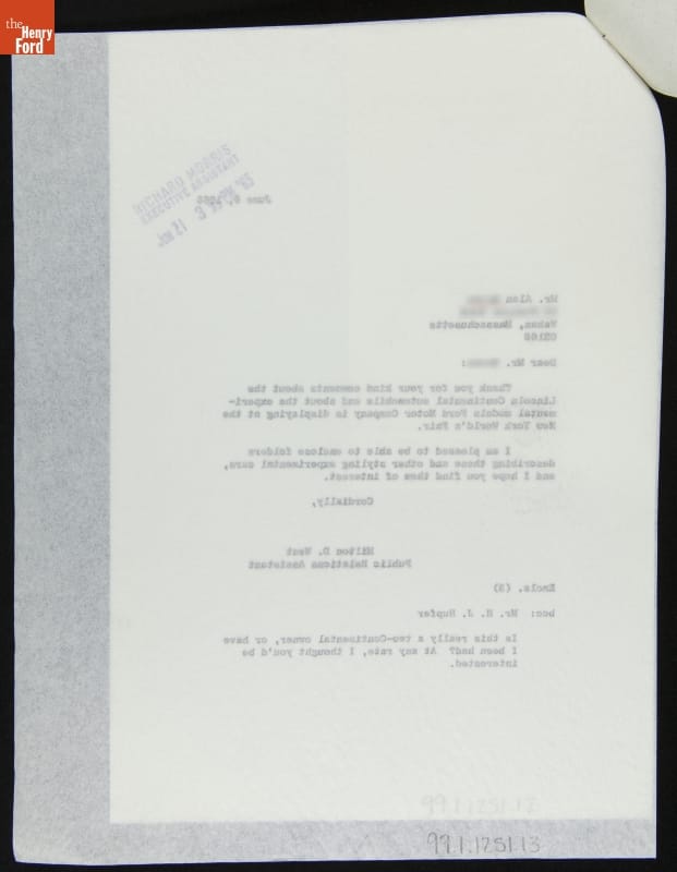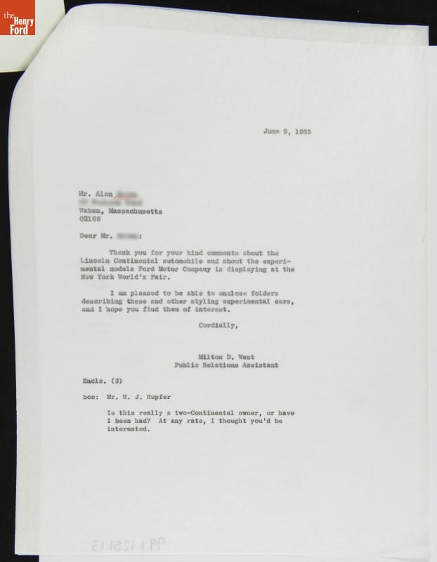 In 1965, a 12-year-old Massachusetts enthusiast wrote to Ford Motor Company. The boy, named Alan, complimented Ford on the Lincoln Continental and various concept cars he saw at the New York World's Fair. Milton D. West, a Ford public relations assistant, replied by sending Alan publicity materials with more information about some of Ford's concept cars.